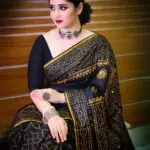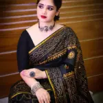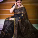 রেশমসিল্ক শাড়ী তে চুনডি ব্লক প্রিন্ট কাজ করা এবং ডলার বসানো কাজ।